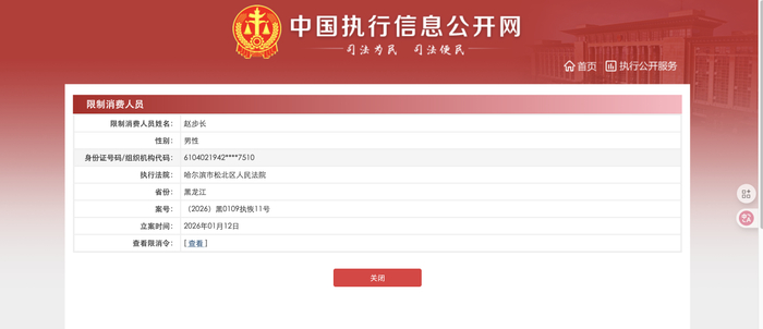 据中国执行信息公开网显示,因未按执行通知书指定的期间履行生效法律文书确定的给付义务,1月20日哈尔滨市松北区人民法院于对安图道自然大酒店有限公司(以下简称“安图道自然大酒店”)采取限制消费措施,对公司法定代表人赵秀琴、主要负责人赵步长限制实施高消费及非生活和工作必需的消费行为。