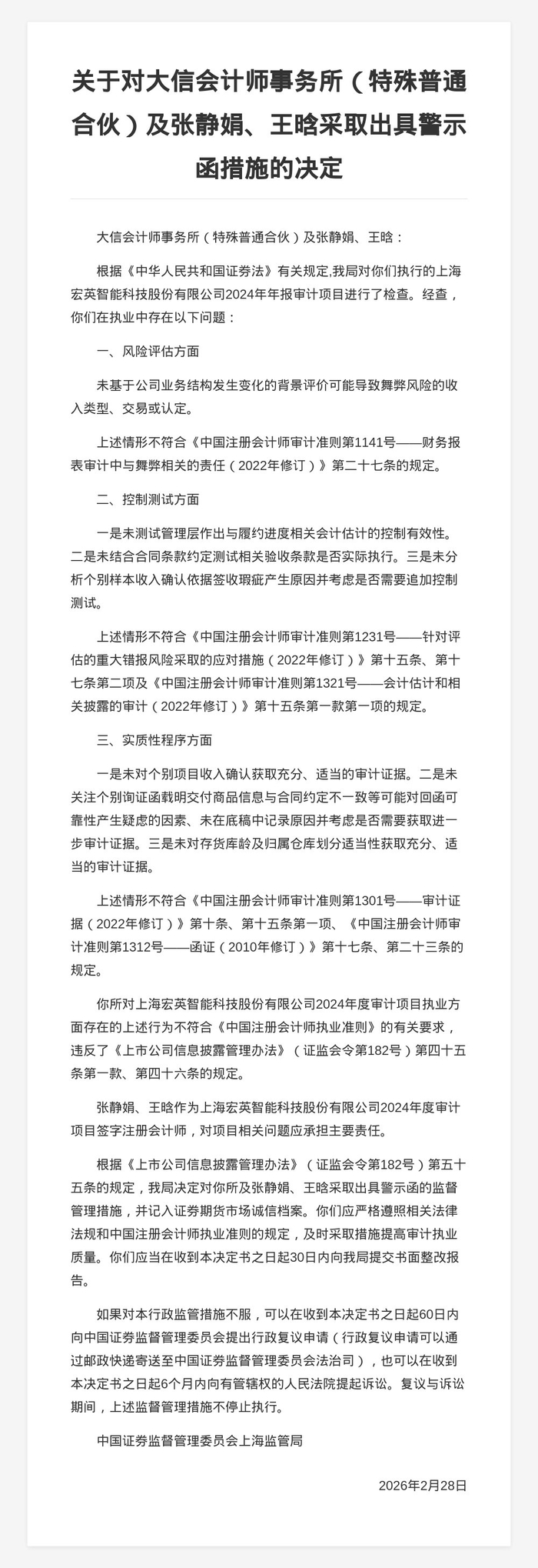 对此,中国证券监督管理委员会上海监管局决定对大信会计师事务所(特殊普通合伙)及张静娟、王晗采取出具警示函的监督管理措施,并记入证券期货市场诚信档案。