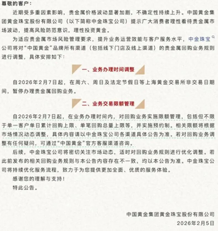 2月6日,中国黄金集团黄金珠宝股份有限公司在官方微信公众号发布公告,宣布自次日起在周末及法定节假日暂停办理贵金属回购业务,同时实施限额管理与预约制。