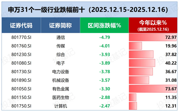 受美股科技股下跌情绪传导,A+H市场的科技股在12月15日、16日这两天也是大幅下跌,申万31个一级行业中,跌幅最多的,也都是之前的热门科技板块,包括通信、电子、计算机、医药生物等。