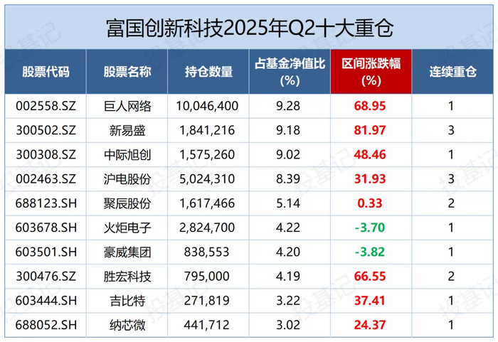 例如,在2025年二季度,在中美贸易摩擦期间,他成功捕捉AI需求回暖信号,迅速加仓沪电股份(002463)、新易盛(300502)、中际旭创(300308)等算力产业链核心企业,同时布局巨人网络(002558)、纳芯微(688052)等应用与芯片环节,提前布局AI商业化落地标的。