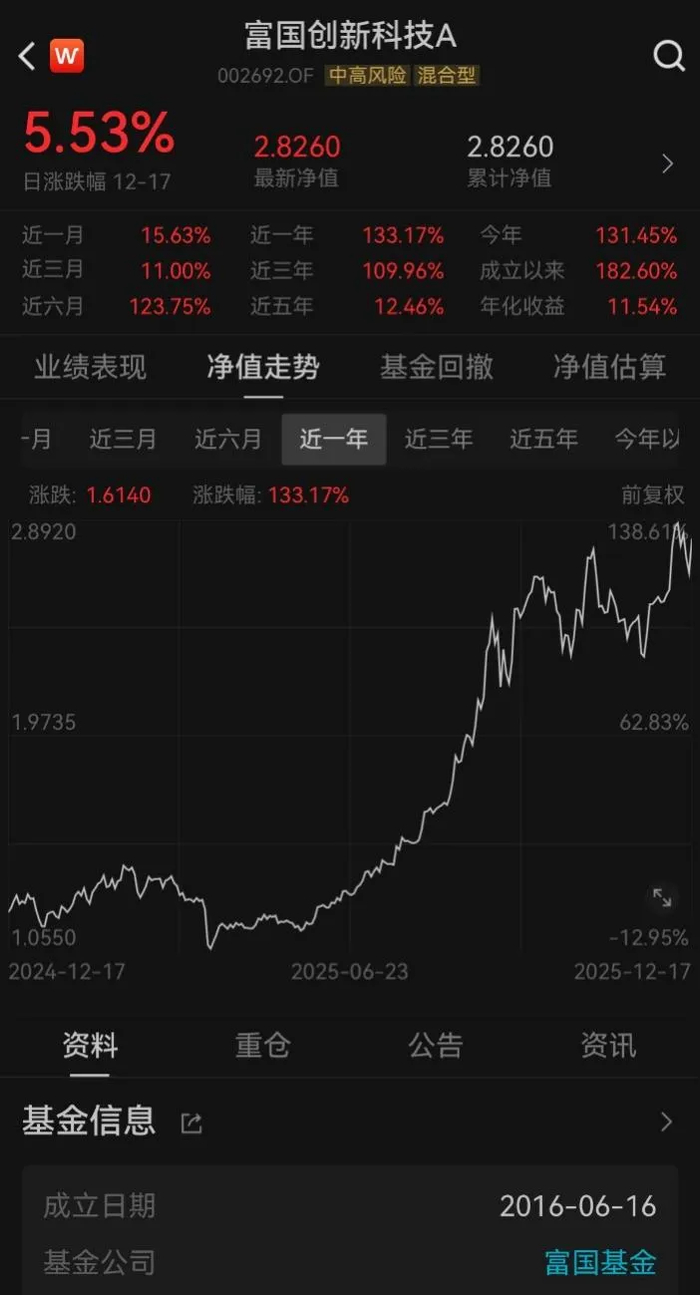 从业绩来看,截至12月17日富国创新科技A近六个月收益率达123%,同期业绩比较基准24.74%,超额收益超100%。(数据来源于Wind,时间截至2025.12.17)