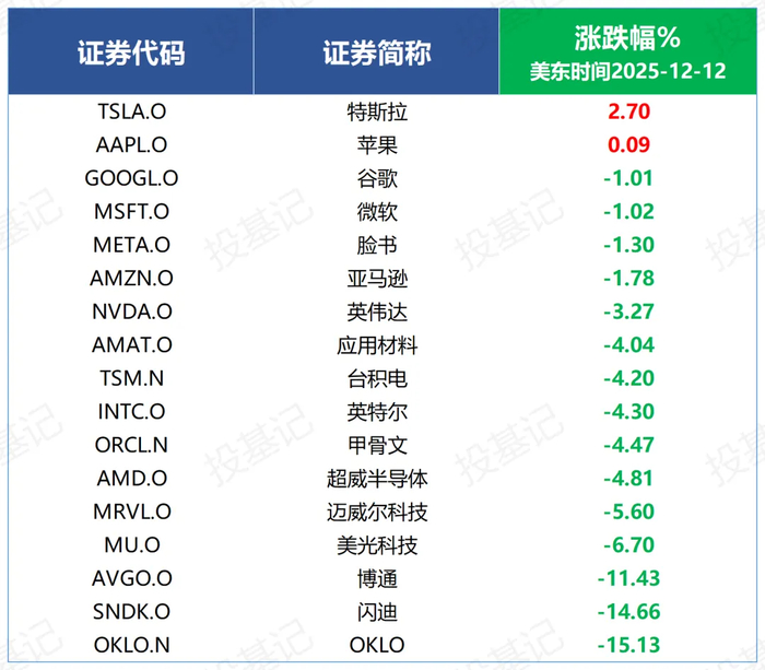 尤其这两天,美东时间12月12日,美股科技股除特斯拉、苹果外,几乎全线重挫,博通暴跌超-11%,甲骨文、台积电大跌超-4%,英伟达跌-3.27%。