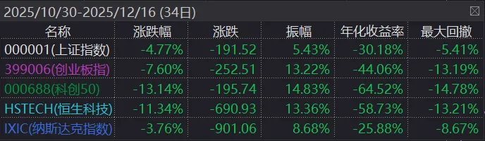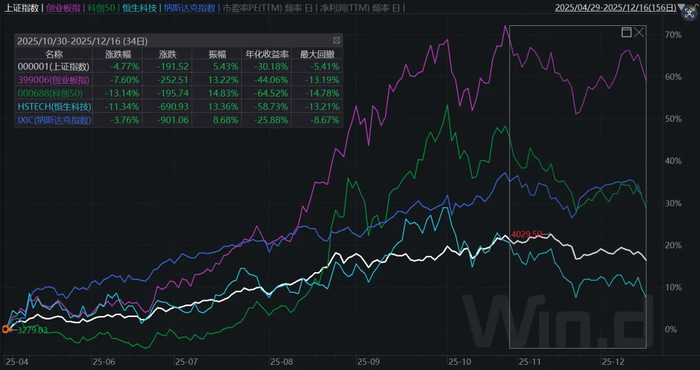 这些企业大多来自科创板和创业板,因此10月底,11月初以来,科创50下跌超-13%、创业板指也跌近-8%。(数据来源Wind,时间区间2025.10.30-2025.12.16)
