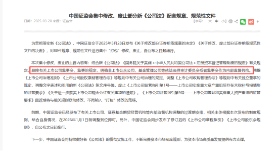 今年3月,证监会发布配套规定,要求上市公司应当在2026年1月1日前,按照有关规定,在公司章程中规定在董事会中设审计委员会,行使《公司法》规定的监事会职权,不设监事会或者监事。