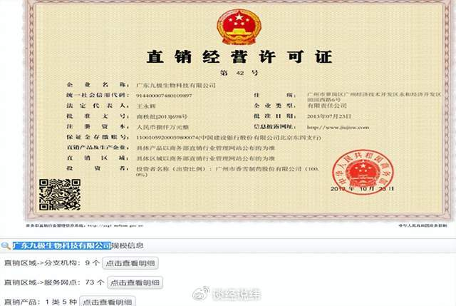 商务部公示信息显示,广东九极生物科技有限公司(以下简称“九极生物”)于2013年7月23日获批第42号直销经营许可证。直销区域分布于广州市、福建、浙江、江西、四川、吉林、云南、青岛、贵州等9个区域,直销服务网点共73个,直销培训员仅2人。