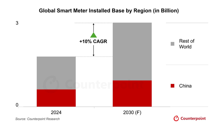 智通财经APP获悉,根据Counterpoint Research发布的《全球智能仪表报告》,截至2024年底,全球智能仪表安装量已超过18亿台,预计将以10%的年复合增长率(CAGR)增长,至2030年底将超过30亿台。在电网现代化和监管要求的支持下,预计2025年及以后智能仪表出货量将强劲增长。