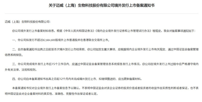 智通财经APP获悉,11月21日,中国证监会国际合作司发布《关于迈威(上海)生物科技股份有限公司境外发行上市备案通知书》。迈威生物(688062.SH)拟发行不超过62,664,600股境外上市普通股并在香港联合交易所上市。该公司曾于2025年1月6日及2025年8月29日向港交所提交上市申请,中信证券和海通国际为其联席保荐人。