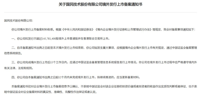 智通财经APP获悉,12月2日,中国证监会国际合作司发布《关于国民技术股份有限公司境外发行上市备案通知书》。国民技术(300077.SZ)拟发行不超过145,781,400股境外上市普通股并在香港联合交易所上市。