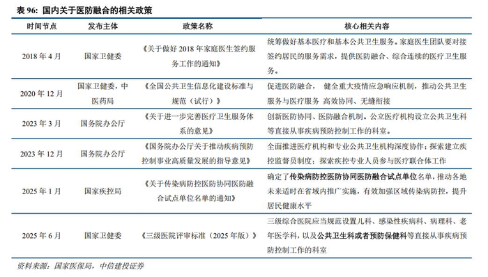 医防融合政策陆续出台,从概念提出到措施落地。在中国,面对公共卫生事件的突发性和人口老龄化的加剧,医防融合的战略意义和急迫性愈加凸显。医防融合旨在破除公共卫生与医疗服务体系间的隔阂,通过预防与医疗资源的整合共享,构建起全方位、立体化的健康服务体系。自2018年首次在政策端提出以来,国家高度重视医防融合概念,并出台了一系列相关政策。2025年至今,国家疾病预防控制局和卫生健康委先后发布《关于传染病防控医防协同医防融合试点单位名单的通知》和《三级医院评审标准(2025年版)》,强化了医疗机构在疫苗接种服务中的职能定位,通过医防融合试点促进疫苗接种服务与临床医疗的有机结合,从而推动医防融合概念落地,为提升接种覆盖率和服务质量奠定了制度基础。
