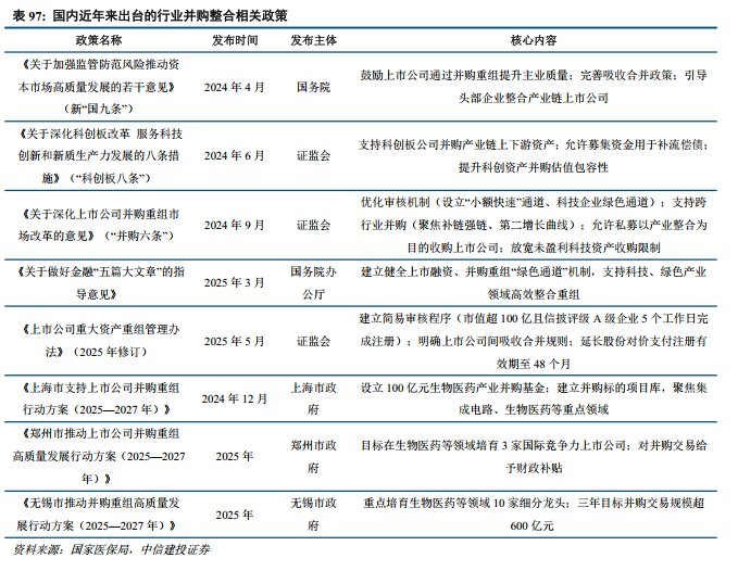 行业并购相关政策陆续出台,重点关注医药领域。近年来,国内围绕行业并购整合出台了一系列顶层设计与地方配套政策,形成“中央引导+地方落实”的政策体系,重点支持科技领域补链强链、传统产业升级及产业链协同整合,并简化并购重组交易相关审核流程,允许使用创新支付工具,增强监管包容。从各地政策来看,生物医药、电子科技等领域成为鼓励并购重组的重点行业,有助于疫苗行业的实现并购整合,提高行业集中度的同时减少无序竞争,促进行业健康发展。