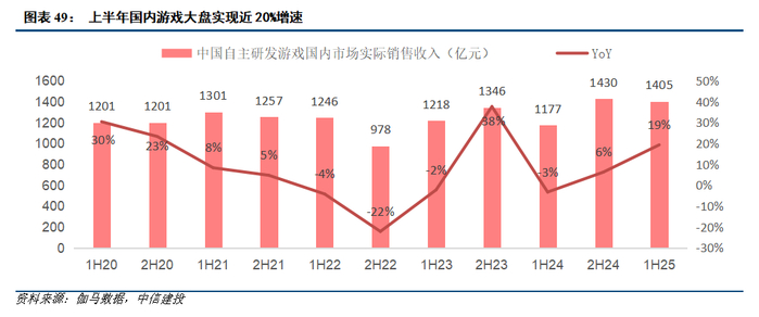 今年游戏行业高景气,上半年大盘在千亿规模的基础上,仍实现近20%增长。20年上半年用户宅家时间较长,线上休闲娱乐需求提升,驱动中国自主研发网络游戏规模同比增长30%至1201亿元。21年上半年虽然有《原神》等爆款游戏贡献增量,但国内游戏用户规模触顶(21年国内游戏用户增速0.22%)、宅家时间缩短,21年上半年游戏大盘增速放缓至8.30%。此后受限于未成年防沉迷、版号管控等因素,1H22、1H23、1H24大盘规模均小幅下滑。