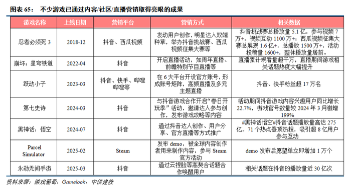 游戏宣发形式多样化,内容/社区/直播营销的占比提升。随着传统买量成本持续增加,游戏公司对买量投放的ROI管控趋于严格,以及年轻一代游戏用户越来越倾向于通过抖音、小红书等社交平台获取资讯,传统买量占比下降,内容/社区/直播营销的份额在提升。虽然还没有第三方数据准确统计不同营销方式的预算占比,但该行可以从三个角度验证这一趋势: