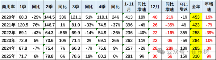近几年国内商用车市场呈现需求快速下降趋势。从2020年的超高销量,到2021年的峰值回落,2022年处于低谷期,2023-2024年商用车国内保险实现285万台左右,同比几乎持平。