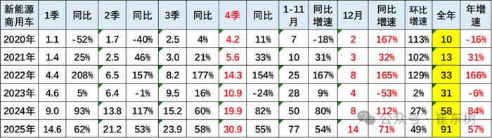 2024年新能源商用车销量57.9万台,同比增长84%;在2024年末政策翘尾后,2025年1月新能源表现相对较弱,随后同比暴增,2025年12月份新能源商用车达到14万台,同比增长71%,环比增49%;1-12月新能源商用车累计达到91万台,同比增长57%。