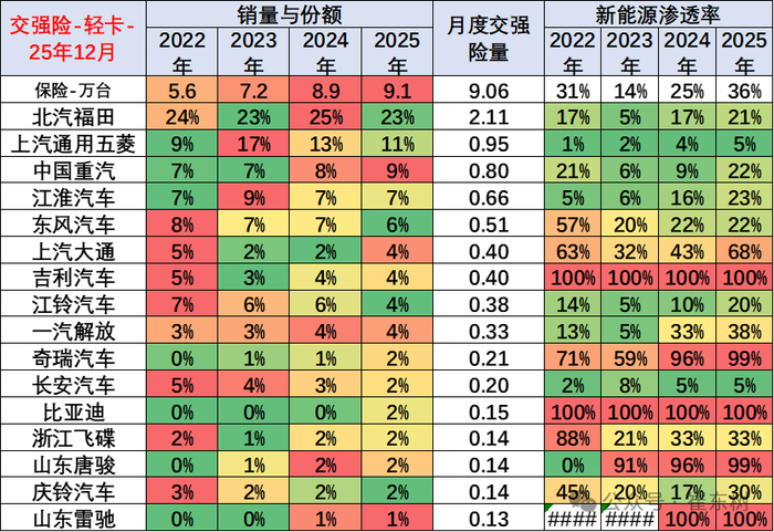智通财经APP获悉,1月29日,乘联分会秘书长崔东树发文介绍2025年12月全国商用车国内保险特征。根据国家金融局交强险数据,国内商用车交强险数据的2025年商用车强势增长。由于新能源车强势增长和政策促进车辆更新,2025年新能源商用车整体呈现快速拉升的良好局面。3-12月持续高位,新能源增长较强。今年商用车年末增长较强,12月商用车国内销量实现30万台,同比增5%,环比增15%。2025年1-12月商用车国内销量实现310万台,同比增长9%,相对于2022年以来的商用车平稳期,今年创出近几年新高的良好水平。