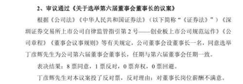 在选举董事长的议案中,共有9人投票,8票赞成,1票反对,反对者就是“董事长”丁彦辉本人。