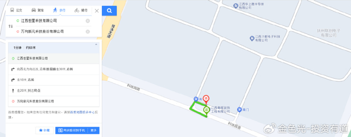 2021年3月,*ST新元与世星科技签署了《分布式存储中心项目》销售合同。公告披露,世星科技的注册地址为江西省抚州市临川区科技园路666号临川高新科技产业园1-2栋。而*ST新元同样位于临川高新科技产业园。根据地图信息,两家公司间仅有1分钟步行路程。