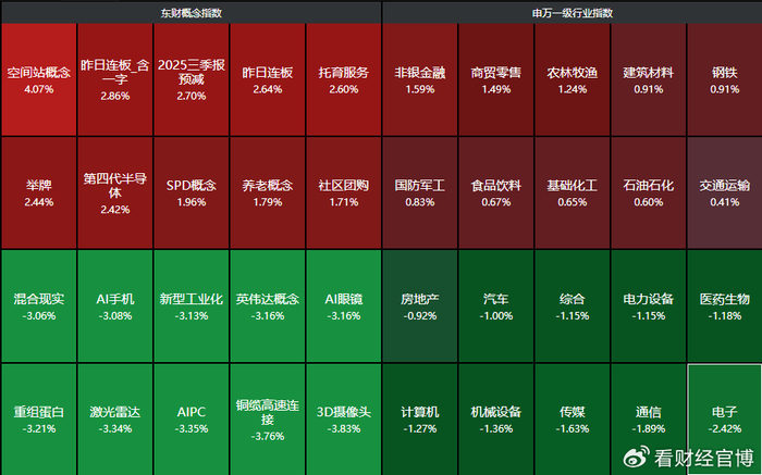分行业来看,非银金融、商贸零售、农林牧渔、建筑材料、钢铁等行业领涨,电子、通信、传媒、机械设备、计算机等行业领跌。