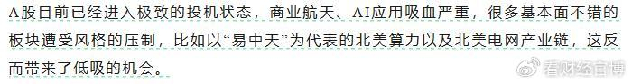 前几天的文章主要提了两个观点:其一,A股进入极致投机的状态,要小心管理层降温;其二,由于市场投机盛行,题材股对部分有业绩的板块吸血,这反而带来了机会。而这两点在这两天得到了兑现,昨天证监会提高融资保证金比例,商业航天、AI应用跳水,但是半导体、北美算力、电网设备等板块却大幅走强,特别是今天午盘半导体设备、光模块、pcb上游材料等细分板块爆拉,中际旭创一度涨超7%,特变电工涨超6%。