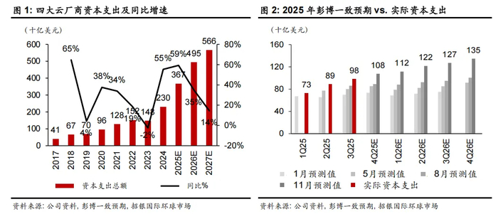 全球AI大模型竞争白热化,谷歌、微软、Meta、亚马逊这些巨头拼命砸钱建数据中心。2024年,美国四大云厂商资本开支达到2300亿美元,同比增长55%;2025年前三季度进一步增至2590亿美元,增速达到65%。彭博预测2025年全年资本开支将达到3670亿美元,2026年更是要冲到4950亿美元。
