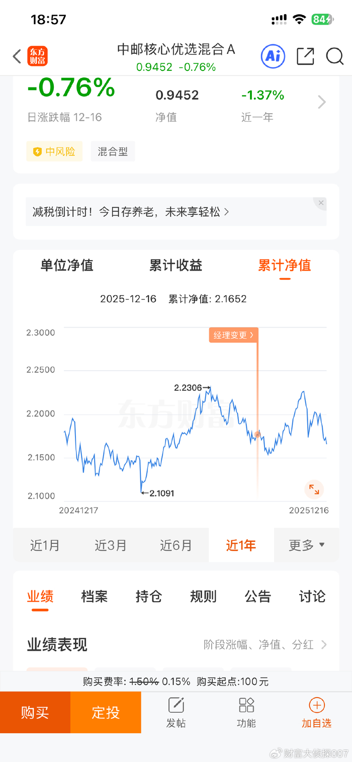 今天来分享的这只产品是——中邮核心优选(590001),这是中邮基金经理陈梁和王高管理的产品。这只基金成立时间超过19年,目前来看,成立以来业绩涨了90.81%,目前累计净值2.1652元,成立以来业绩真的一般吧。这只基金成立时间已经很长了,但是业绩就是这样。关键是,前几年真的太差了,并且近一年更惨,居然是亏损的,真的很好笑了,瞎投都不能够吧!太离谱了!被骂惨了!