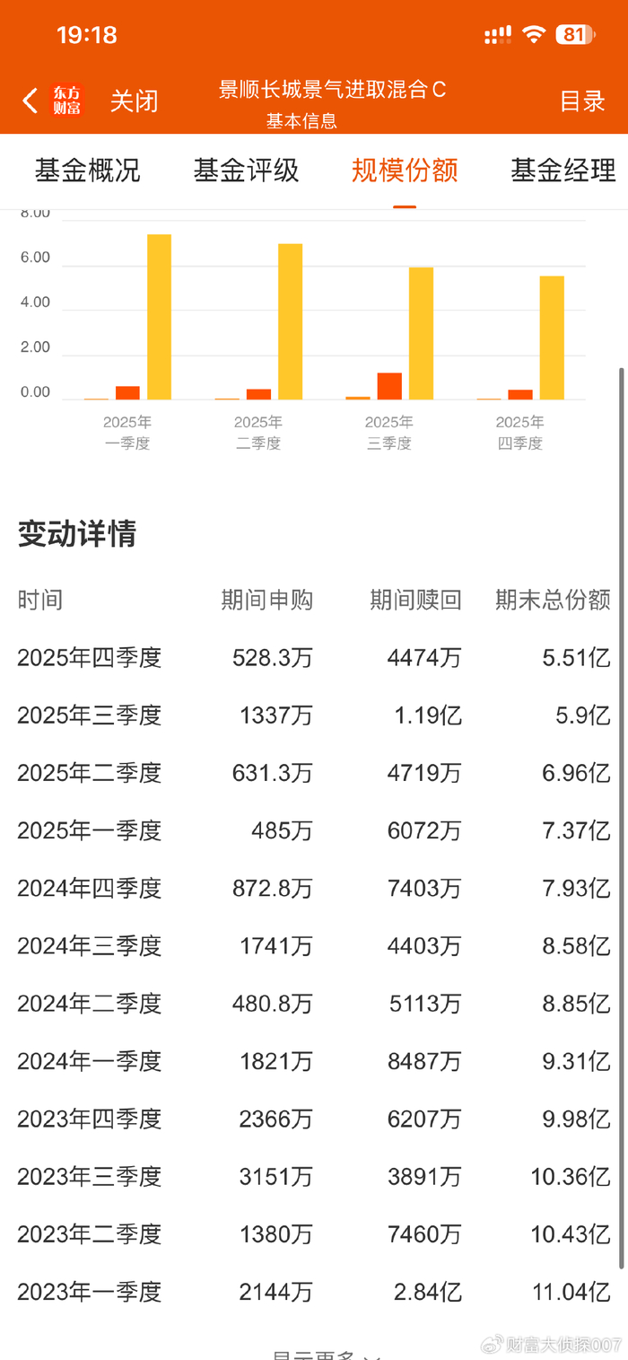 来看看这只基金的规模变化情况,从份额来看的话,这只产品最近两三年整体份额减少了很多。2023年1季度末,是11.04亿份;2024年1季度末,是9.31亿份;2025年1季度末,是7.37亿份;2025年4季度末是5.51亿份。