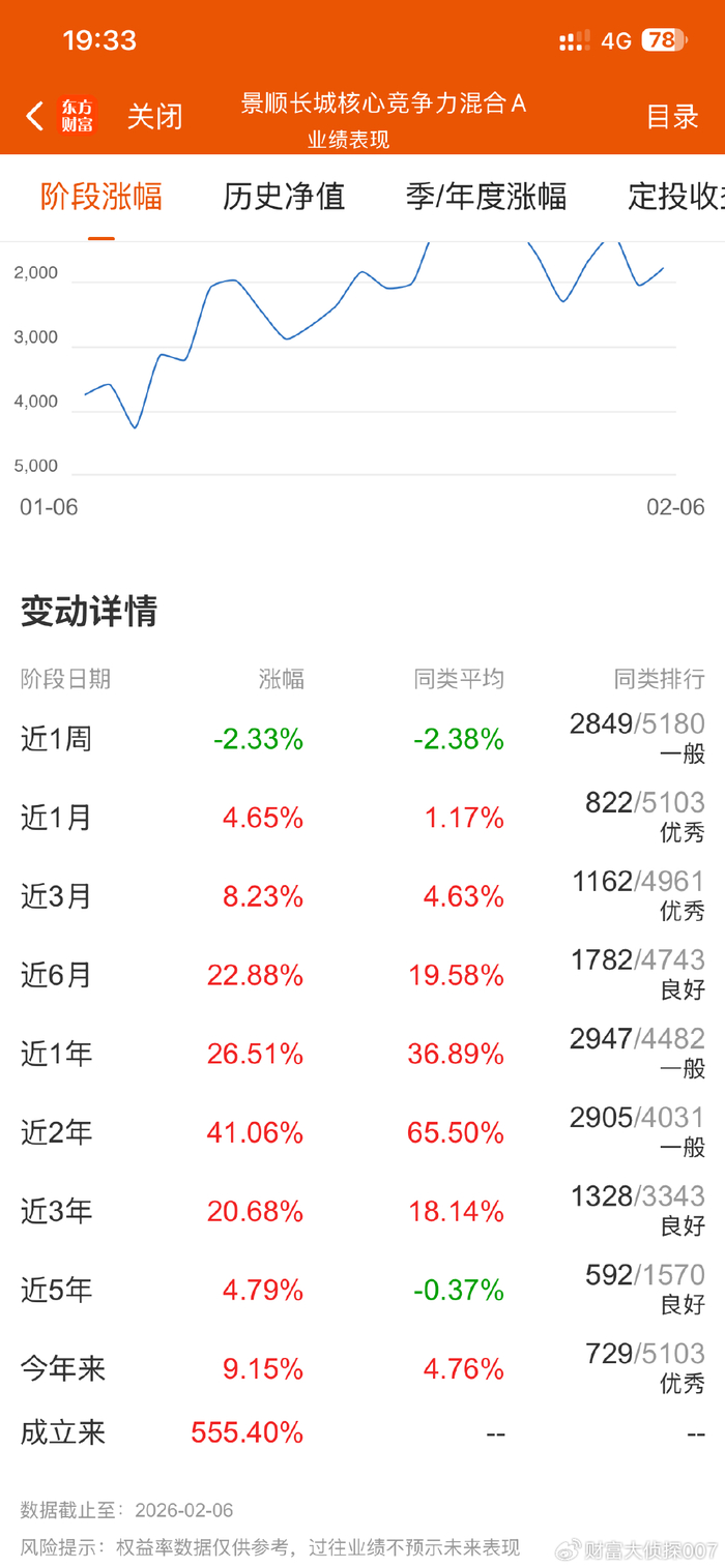 首先是成立以来涨了555.4%。今年来涨了9.15%,同类平均涨了4.76%,排名729/5103,排名优秀。近3年涨了20.68%,同类平均涨了18.14%,排名1328/3343,排名良好。近2年涨了41.06%,同类平均涨了65.5%,排名2905/4031,排名一般。近1年涨26.51%,同类平均赚了36.89%,排名2947/4482,排名一般。近6月涨了22.88%,同类平均涨了19.58%,排名1782/4743,排名良好。