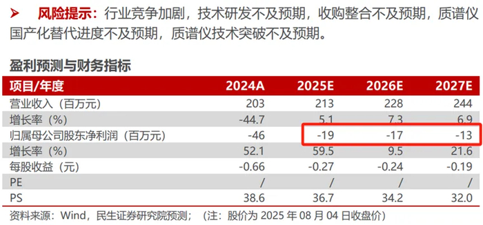 更有意思的是民生证券的吕伟、谢致远两位分析师,在这份报告中针对禾信仪器未来的业绩预测,预计2025年到2027年都将是亏损的。