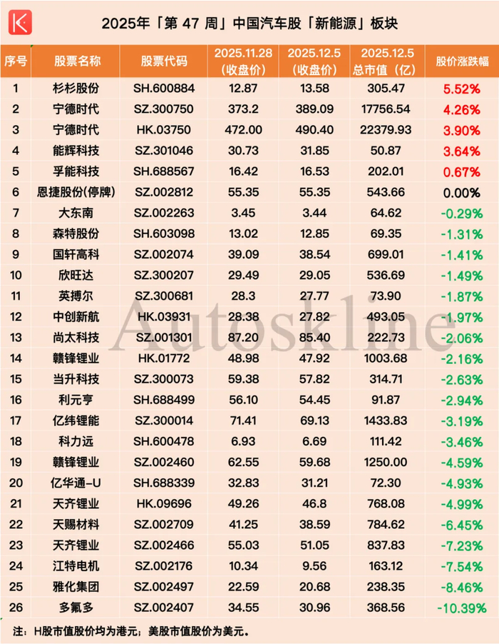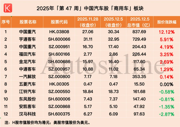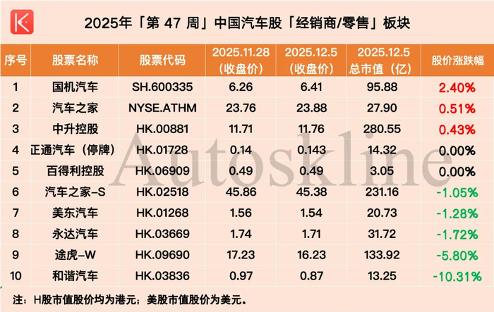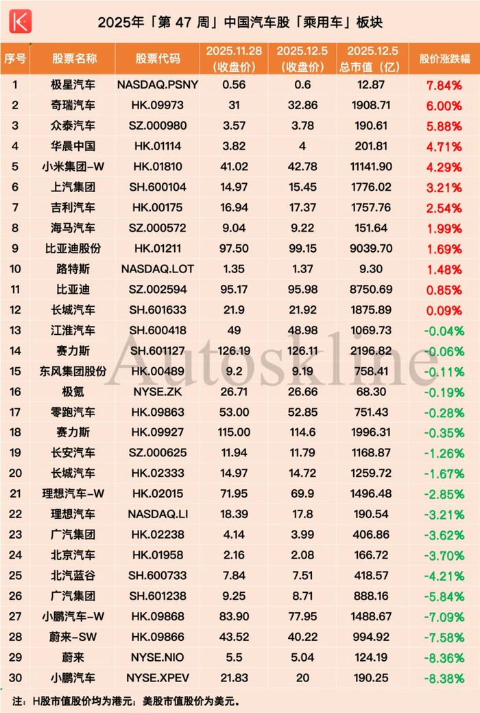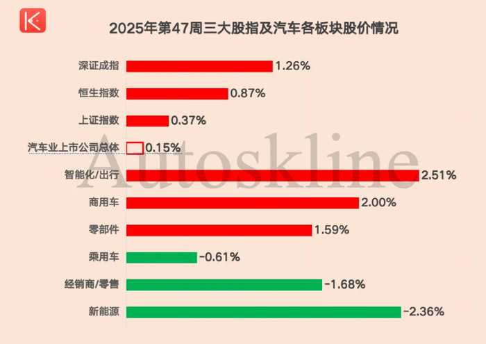聚焦到汽车行业,《汽车K线》统计的120只中国汽车股,第47周涨跌参半,平均股价涨幅0.15%。