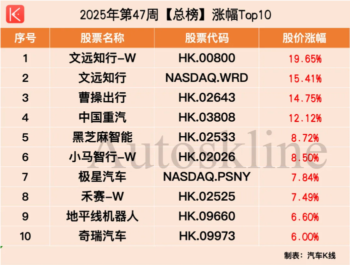 可以说,涨幅TOP5,除了第4位,被中国重汽港股以12.12%的周涨幅拿走外,其余全都落到了智能化/出行板块。