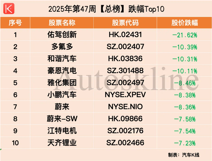 另外,和谐汽车以10.31%的跌幅,跌进总榜倒数第3位;小鹏汽车美股、蔚来双股、江特电机和天齐锂业A股跌进跌幅TOP10,不过跌幅不足10%。