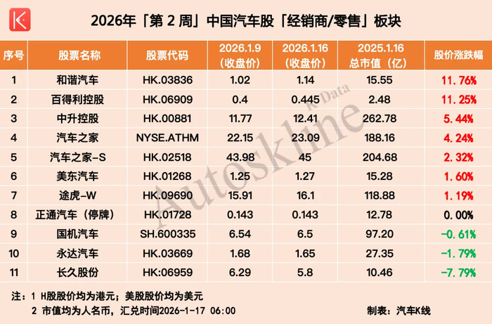 其中,和谐汽车、百得利控股表现抢眼,周涨幅双双突破11%。这或许与年初促销力度加大,主机厂主动为经销商减负,以及豪华车消费韧性有关。