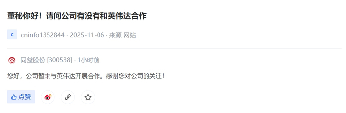 【V观财报|同益股份:公司暂未与英伟达开展合作】同益股份11月18日在投资者互动平台表示,公司暂未与英伟达开展合作。(中新经纬APP)