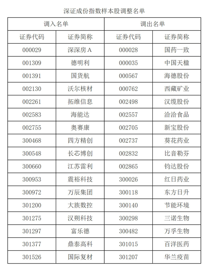 深交所披露的指数样本股调整名单显示,本次深证成份指数更换了17只样本股。其中,深深房A、德明利、国货航、沃尔核材等17只个股被调入,国药一致、中国天楹、海德股份、西藏矿业、葵花药业和比音勒芬等17只个股被调出。