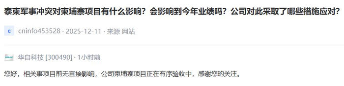 【V观财报|华自科技:泰柬军事冲突对公司柬埔寨项目无直接影响】针对“泰柬军事冲突对柬埔寨项目有什么影响?”相关问题,相关事项目前无直接影响,公司柬埔寨项目正在有序验收中。(中新经纬APP)
