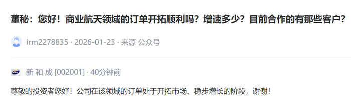 【V观财报|新和成:商业航天领域订单处于开拓市场、稳步增长阶段】新和成1月27日在互动平台表示,公司在商业航天领域的订单处于开拓市场、稳步增长的阶段。(中新经纬APP)