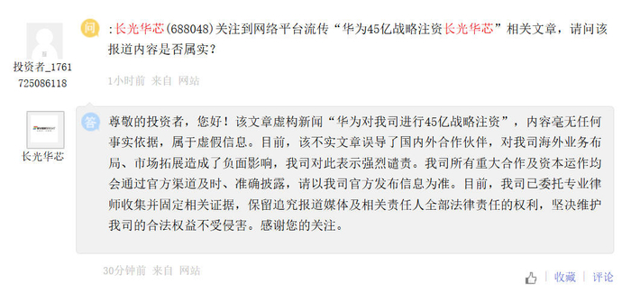 来源:上证e互动有投资者提问称:关注到网络平台流传“华为45亿战略注资长光华芯”相关文章,请问该报道内容是否属实?