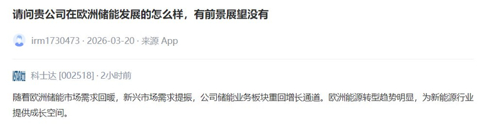 【V观财报丨科士达:公司储能业务板块重回增长通道】科士达3月24日在投资者互动平台回复提问表示,随着欧洲储能市场需求回暖,新兴市场需求提振,公司储能业务板块重回增长通道。欧洲能源转型趋势明显,为新能源行业提供成长空间。(中新经纬APP)