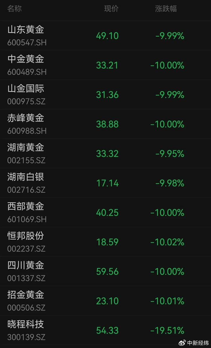A股市场上,贵金属板块持续走低。山东黄金、中金黄金、山金国际、赤峰黄金、湖南黄金、湖南白银、西部黄金、恒邦股份、四川黄金、招金黄金等纷纷跌停。