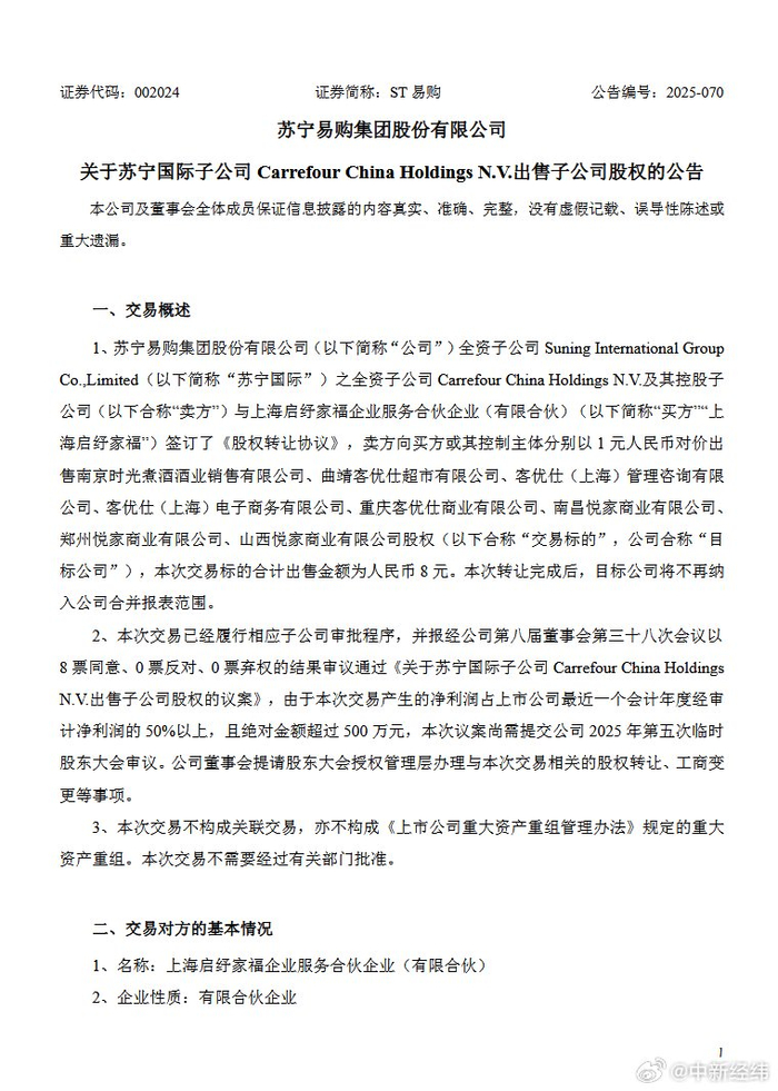 【1元1家!#苏宁易购8元卖掉8家公司#】ST易购12月10日公告,公司全资子公司苏宁国际之全资子公司Carrefour China Holdings N.V.及其控股子公司(合称“卖方”)与上海启纾家福企业服务合伙企业(有限合伙)(简称“买方”)签订了《股权转让协议》,卖方向买方或其控制主体分别以1元对价出售南京时光煮酒酒业销售有限公司、曲靖客优仕超市有限公司、客优仕(上海)管理咨询有限公司等8家子公司,交易标的合计出售金额为8元。本次转让完成后,目标公司将不再纳入公司合并报表范围。本次交易预计本次交易合计增加上市公司归母净利润约9.92亿元。