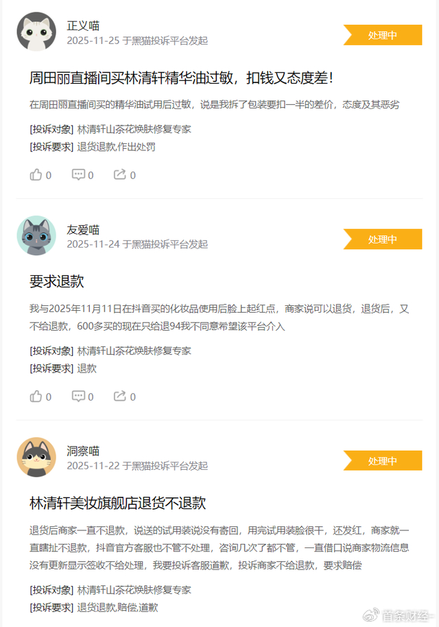 浏览黑猫投诉[下载黑猫投诉客户端]平台,截至12月15日,“林清轩”相关投诉累计176条,主要涉及产品质量不合格、服务态度差、涉嫌虚假宣传等质疑。