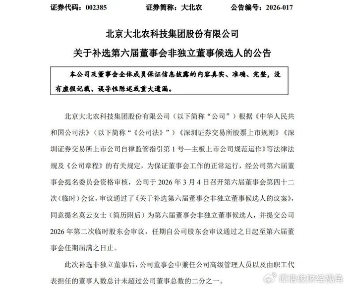 而从媒体披露的情况来看,大北农2025年前三季度还实现收入207.44亿元,归母净利润2.57亿元。但2025年的年度业绩预告,却是预亏4.5亿元至5.8亿元。到底是什么原因导致第四季度出现严重亏损呢?是企业经营方面的原因,还是市场原因,是季节原因,还是政策原因,是国内市场变化,还是国际环境影响,有没有改进办法,如何改善经营条件,等等,而不是把眼睛盯向未成年人继承巨额遗产。
