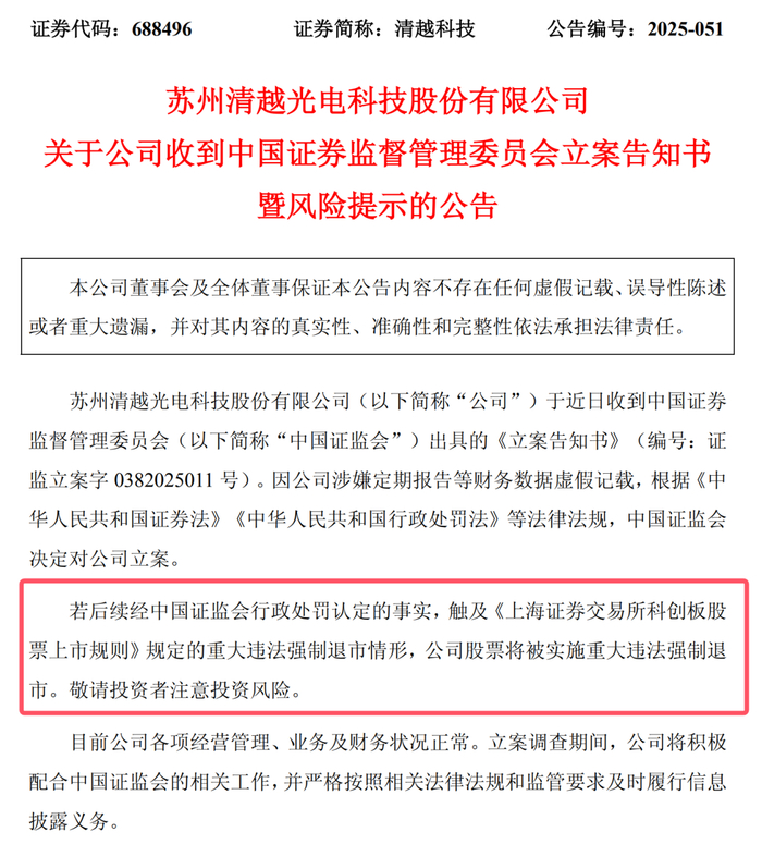 若后续经证监会行政处罚认定的事实,触及《上海证券交易所科创板股票上市规则》规定的重大违法强制退市情形,清越科技将被实施重大违法强制退市。