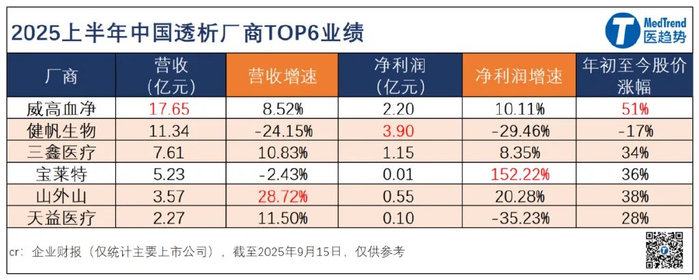 2025年上半年,健帆生物尽管营收位列第二、净利润位居第一,但相较于2024年的高基数,其营收同比下滑24%,净利润同比下滑29%。