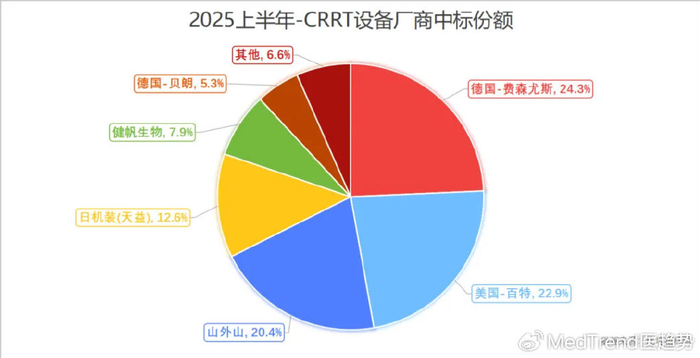 2025年上半年,按中国市场的中标金额统计,德国费森尤斯、美国百特、中国山外山排名前三,日机装(CRRT被中国厂商天益医疗收购)和中国健帆生物紧随其后;CR5市场份额约占88%,而中国厂商占比已超40%。