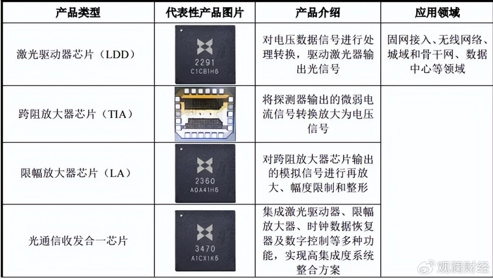 报告期内,优迅股份主要产品包括光通信收发合一芯片、跨阻放大器芯片、限幅放大器芯片、激光驱动器芯片。