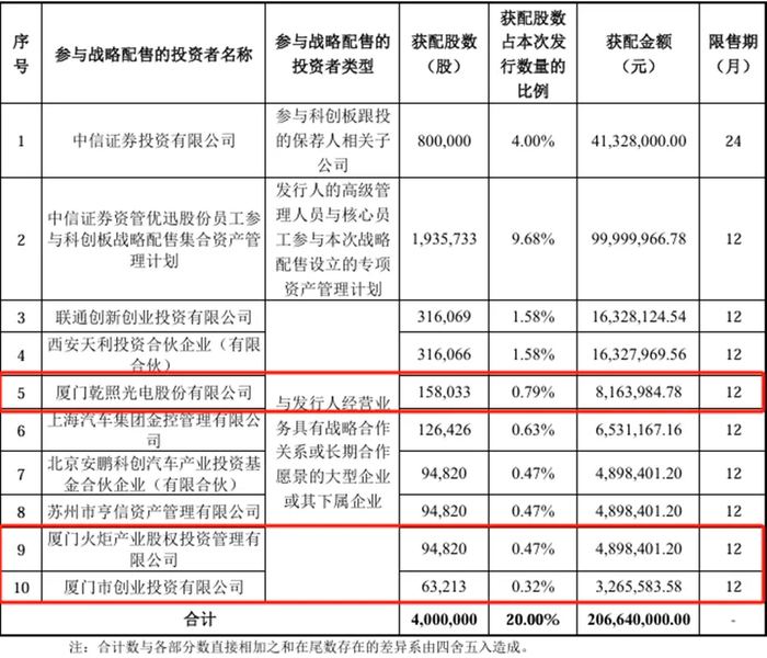 本次战略配售共吸引了10家投资机构参与,包括券商跟投和产业资本,彰显机构对公司前景的认可。其中乾照光电(300102.SZ)、厦门火炬产业股权投资管理有限公司(下称:厦门火炬产投)及厦门市创业投资有限公司(下称:厦门创投)来自厦门,后二者为厦门国资。