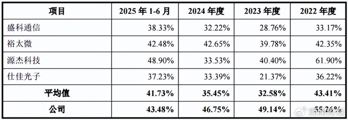 报告期内,毛利率分别为55.26%、49.14%、46.75%、43.48%,高于境内于同行业上市公司平均水平。