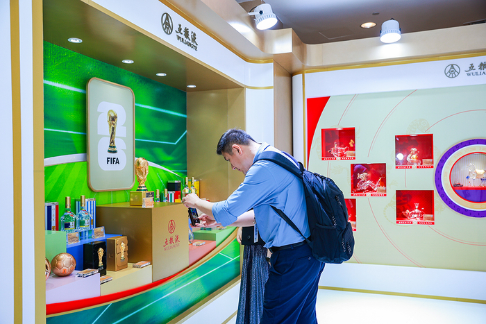 展台以“礼赞二十五周年和美向未来”为设计主线,一面以日晷形态为基础,丙午马年生肖酒作为中心,历年十二生肖酒层层依次陈列,以东方美学诠释岁月流转中匠心坚守;另一面以球场绿荫为主元素,五粮液大力神杯酒、五粮液美加墨世界杯官方徽章酒、五粮液美加墨世界杯水晶纪念酒首次亮相,展现品牌从东方根脉走向全球视野国际化征程。